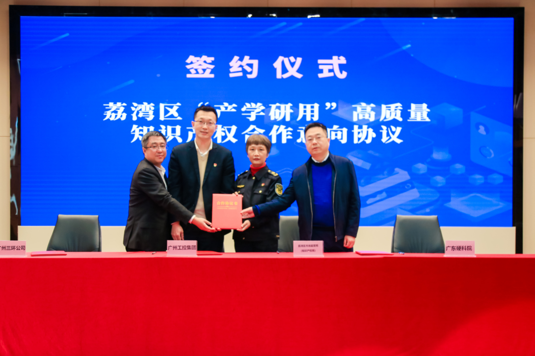 在本次活動中,三環(huán)與荔灣區(qū)市場監(jiān)督管理局、廣州工業(yè)投資控股集團(tuán)有限公司、廣東粵港澳大灣區(qū)硬科技創(chuàng)新研究院(以下簡稱“廣東硬科院”)共同簽訂了《荔灣區(qū)“產(chǎn)學(xué)研用”高質(zhì)量知識產(chǎn)權(quán)合作意向協(xié)議書》,該協(xié)議以搭建荔灣區(qū)“產(chǎn)學(xué)研用”知識產(chǎn)權(quán)創(chuàng)造轉(zhuǎn)化平臺為目標(biāo),旨在探索政府、高等院校、科研院所、企業(yè)、知識產(chǎn)權(quán)服務(wù)機(jī)構(gòu)在知識產(chǎn)權(quán)工作中的共贏模式,并確立四方在今后荔灣知識產(chǎn)權(quán)高質(zhì)量發(fā)展工作中的合作意向。
